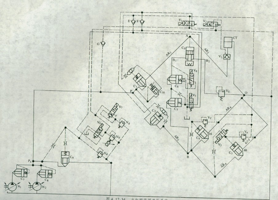 主缸插裝閥液壓系統如圖4.12-34所示。該系統采用液阻橋路系統的分析法加以描述。主缸驅動滑塊w的上、下移動由插裝閥組成的液阻橋路進行控制。橋路由4個液阻橋臂AR1、AR2、AR3、AR4和4個接點P、O、A、B組成。P點接油源,O點接油箱。當AR1、AR4橋臂通導,AR2、AR3橋臂截止時,滑塊W向下行;當AR1、AR4橋臂截止,AR2、AR3橋臂通導時,滑塊W向上行。主缸下腔有兩條中路Bl、B2。中路B1有兩個C6、C5組成的插裝閥電控單向回路,用以確保滑塊下移的準確定位。中路璉接安傘閥VF?;瑝K快降時,充液罐通過充液閥VL補油,插裝閥C3無背壓回油。此時,一臺工作的變量泵N1(泵N2備用)大流量供油。滑塊慢降時,泵N1變為小流量供油,橋臂AR4、ˉAˉRˉ4變成有背壓回油,充液閥關閉。由于溢流閥Ve調定的壓力高于Vf,C4開啟,C3起溢流保護作用?;瑝K對工件進行壓制時,泵Nl進人大壓力小流量工作狀態。滑塊向上回程時,主缸上腔回油通過充液閥VL回到充液罐CT?;瑝K靜止時,4個液阻橋臂都變成截止狀態。液壓泵出口處的多級調壓回路,可使整個液壓系統有三種壓力,電液比例壓力閥Vh,可遠程控制壓制壓力,Vg為低壓溢流閥用以調整過程。Vd起安全溢流作用。所有主油路的插裝閥,由相應的先導電磁換向閥Vl … V7控制。