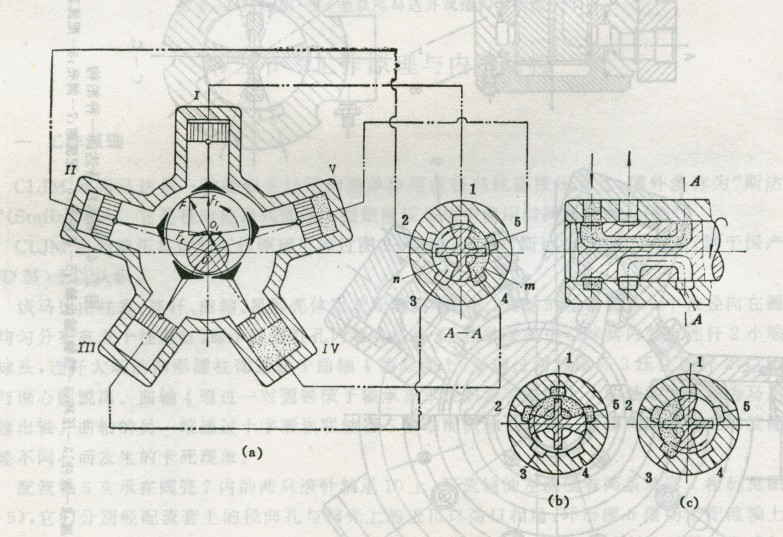 隨著曲軸的旋轉(zhuǎn),配流軸也跟著旋轉(zhuǎn),從而使各柱塞缸與配流軸上配流窗口m和n的相對位置即配流狀態(tài)發(fā)生變化。當曲軸在0~90°范圍內(nèi)轉(zhuǎn)動時,柱塞缸I由過渡狀態(tài)接通壓力油,隨后柱塞缸II也由回油狀態(tài)接通壓力油。而與此相反,柱塞缸IV則由接通壓力油換成接通回油(圖2-6右下角所示的曲軸轉(zhuǎn)過90°時配流狀態(tài))。此時曲軸輸出的扭矩與圖2-6所示配管連接的原始位置相比,變?yōu)橛蒊、II、V三個柱塞缸產(chǎn)生的扭矩之和,但扭矩方向仍未改變。當曲軸由90°繼續(xù)轉(zhuǎn)到180°時,I缸又重新處于封閉過渡狀態(tài),而柱塞缸II、III都已換成與壓力油相通,柱塞缸IV、V則換成與回油相通,曲軸上的扭矩又變成由兩個柱塞缸產(chǎn)生的扭矩之和。當曲軸轉(zhuǎn)過180°時,柱塞缸工作腔與壓力油和回油換接一次,扭矩方向仍未改變。當曲軸由180°轉(zhuǎn)到360°時,各柱塞缸又發(fā)生相反的轉(zhuǎn)換,又回到圖2-6所示配管連接狀態(tài),重復以上過程。