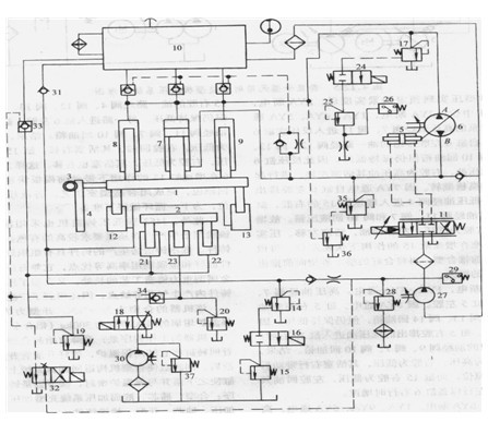 當閥24處于通路時,泵6A口排出的油液壓力靠調壓閥25控制。卸壓后壓力繼電器使泵6反向,B口排油;,安全閥35限定的壓力為21MPa。缸7、8、9活塞}二行,上腔的油回到泵6A口。缸12. 13靠泵27來的油補充。泵27同時也是閥ll的能源,其壓力由閥28調定,其調定值為3MPa。壓力繼電器29保證閥l1的能源壓力達到一定值時才接通電源使閥11開始工作。