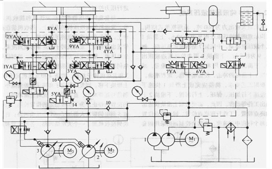 機器的液壓系統由兩部分組成:控制油路和動力油路。控制油路由雙聯齒輪泵l供油,動力油路由變量柱塞泵2、3供油。