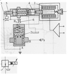 i-比例電磁鐵2-主閥心3、6-不可調節流閥4-先導閥心5一壓力反饋推桿