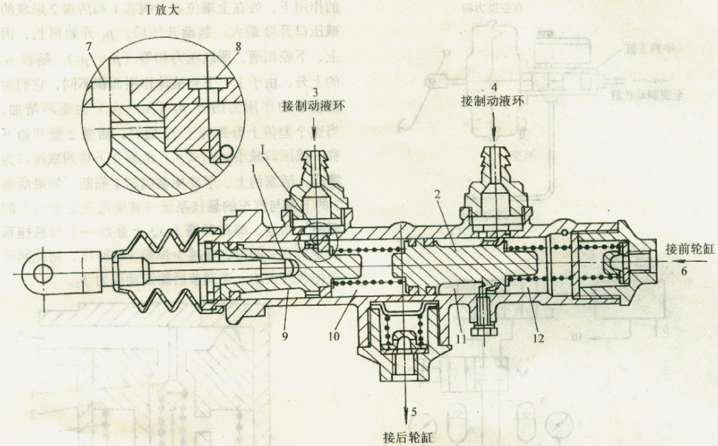 圖2是一種串列式雙腔主缸的結構示意圖。主缸內的前后兩個活塞1、2將主缸分隔成兩個貯液腔9(即活塞周圍的環形空間)和兩個工作腔10(內有回位彈簧)。在缸壁上有兩個較大的旁通孔7和兩個較小的補償孔8。在主缸處于非工作狀態時,大孔、小孔、貯液腔和工作腔與主缸制動液杯相通。使系統任何部分的滲漏損失的油液及時從制動液杯得到補償。
