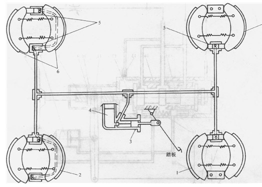 1- 后輪制動器2一前輪制動器3-主缸4-制動液杯5-制動輪缸6-制動蹄