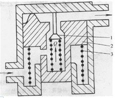 研究表明,當前輪制動壓力p1較小時,后輪制動壓力p2允許和p1相等。當p1較大時,應使p2小于p1。為此可采用定比減壓閥,該閥的結構原理圖見圖4.16-6。