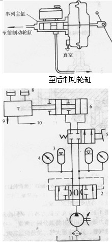 1一空氣壓縮機2事故切斷閥3一蓄能器4-壓力表s-腳踏制動閥6串聯氣動缸7串聯液壓缸8一蓄液杯9一至前制動輪缸10一至后制動輪缸11一空氣過濾器