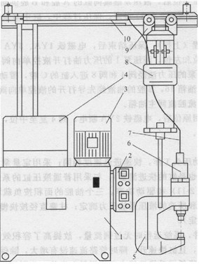 1-油箱;2-電氣控制箱;3-電動機;4-液壓發生器;5-鉚鉗;6-液壓缸 7-油管;8一懇吊裝置;9-小車;1O-導線