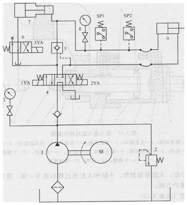1-定量液壓泵; 2-溢流閥;3、8-壓力表及其開關;4-一位四通電磁換向閥;5-液控單向閥;6–二位四通電磁換向閥;7-增壓器;9-動力液壓缸, SP1、SP2-壓力繼電器