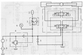 1-電液換向閥;2-蓄能器;3-單向節(jié)流閥;4-卸荷閥;5-截止閥6-壓力表;7-液壓泵;8-過濾器;9-液壓缸