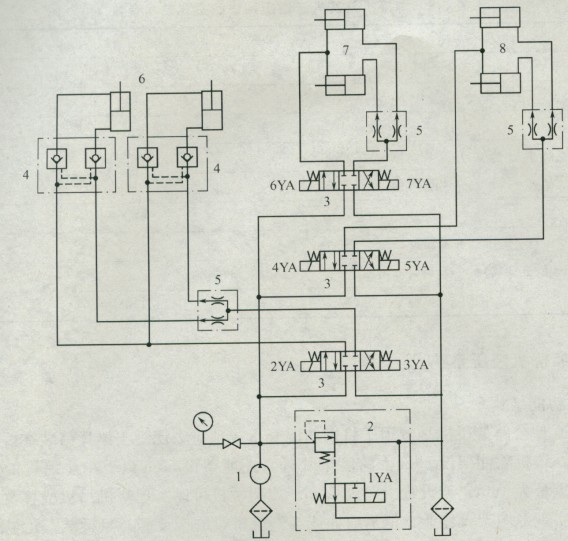 該公路架橋機共有三套獨立的液壓系統:1號柱、2號柱各用一套液壓系統,液壓原理圖如圖6-27所示;0號柱和3號柱合用一套液壓系統,液壓原理圖如圖6-28所示。