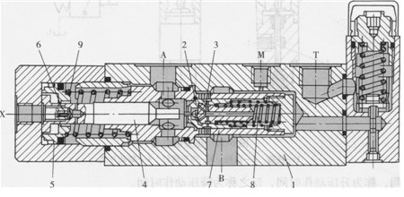 圖6-33所示為在工程機械領域得到廣泛應用的一種平衡閥結構。重物下降時的油流方向為B-÷A,X為控制油口。當沒有輸入控制油時,由重物形成的壓力油作用在錐閥2上,B口與A口不通,重物被鎖定。當輸入控制油時,推動活塞4右移,先頂開錐閥2內部的先導錐閥3。由于閥3右移,切斷了彈簧8所在容腔與B口高壓腔的通路,該腔快速卸壓。此時,B口還未與A口溝通。當活塞4右移至其右端面與錐閥2端面接觸時,其左端圓盤正好與活塞附件5接觸形成一個組件,并在控制油作用下壓縮彈簧9繼續右移,打開錐閥2,B口與A口相通,其通流截面依靠閥套7上幾排小孔來逐漸增大,從而起到了很好的平衡阻尼作用。活塞4左端中心部分還配置了一套阻尼組件6。這樣,平衡閥在反向通油時就比較平穩。