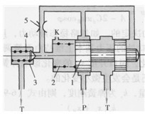 圖6-25所示為先導(dǎo)控制式溢流閥的工作原理。它由先導(dǎo)閥和主閥組成,主閥左腔設(shè)有遠(yuǎn)程控制口K。當(dāng)K口關(guān)閉時,系統(tǒng)的壓力作用于主閥1左右兩側(cè)及先導(dǎo)閥3上。當(dāng)先導(dǎo)閥3未打開時,腔中液體沒有流動,作用在主閥1左右兩側(cè)的液壓力平衡,主閥1被彈簧2壓在右端位置,閥口關(guān)閉。當(dāng)系統(tǒng)壓力增大到使先導(dǎo)閥3打開時,液流通過阻尼孔5、先導(dǎo)閥3流回油箱。由于阻尼孔的阻尼作用,使主閥1右端的壓力大于左端的壓力,主閥1在壓差的作用下向左移動,打開閥口,實現(xiàn)溢流作用。調(diào)節(jié)先導(dǎo)閥3的調(diào)壓彈簧4,便可實現(xiàn)溢流