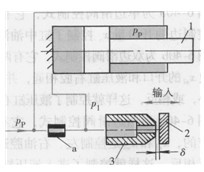 圖6-42所示為噴嘴.擋板裝置的工作原理。它由噴嘴3、擋板2和液壓缸1組成。液壓泵來的壓力油p。一部分直接進入液壓缸1有桿腔,另一部分經過固定節流孔a進入液壓缸1的無桿腔,并有一部分經噴嘴一擋板間的間隙6流回油箱。當輸入信號使擋板2的位置(亦即是鰳改變時,噴嘴.擋板間的節流阻力發生變化,液壓缸1無桿腔的壓力p.亦發生變化,液壓缸1就產生相應的運動。