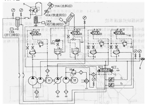液壓系統原理如圖4.3-3所示。液壓控制系統主要由兩通插裝閥1~5電液閥7和電磁閥6組成。直動式順序閥9及單向閥構成門栓柱塞控制回路。10為直動溢閥,8為壓力繼電器。