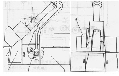 如圖4.3-2所示,該機由主機3、液壓站1、閥塊5、控制箱4和下機架2等五部分組成。主機3以45°傾角安裝于下機架2上。主缸(壓料缸)、門缸、控制門、門栓及壓模腔五大總成構成主機工作機構。主缸和門缸分別位于壓模腔的上下兩端。