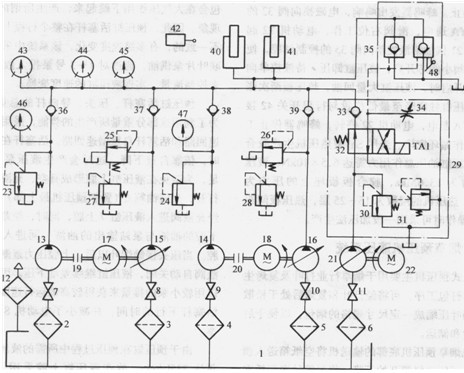 SY型熱壓機液壓系統由五臺液壓泵供油,13和14為低壓齒輪泵,15和16為高壓徑向柱塞泵,每臺雙出軸電動機分別驅動齒輪泵和柱塞泵各一臺;電磁離合器19和20連接在齒輪泵軸和電動機軸之間;液壓泵21為高壓徑向柱塞泵,由電動機22驅動。液壓缸40和41為兩組柱塞液壓缸,每組為3臺液壓缸,總計6臺。溢流閥23與24分別對此輪泵13與14的供油回路起安全保護作用;溢流閥25、26和30由遠程調壓閥27、28和31分別對柱塞泵15、16和21供油回路起調定壓力作用;組合閥29內有二位四通電磁換向閥32,節流閥34對液控單向閥組35的控制油路起調速和排油作用,液控單向閥組35有兩個并聯的液控單向閥,其中一個有操縱手柄48,在緊急狀況下(液控失靈),可借助手柄48開啟液控單向閥;閥33、36、37、38和39均為單向閥;43為普通壓力表,44、45、46和47均為電接點壓力計;液壓泵的吸油管路上裝有過濾器2、3、4、5和6,以及截止閥7、8、9、10和11;油箱1上裝有空氣過濾器12;行程開關42用來當熱壓板下降至最低位置時,發出工作循環終止的信號。