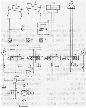 泥炮是用來堵塞高爐出鐵口的專用設備。液壓泥炮的結構原理如圖1所示。打泥油缸4直接推動泥缸,將泥料經吐泥口注入出鐵口。壓炮缸3推動移動吊掛小車,可使打泥油缸進入或離開工作位置。打泥口處在工作位置時,錨鉤缸1使打泥口穩定在工作位置。擺動液壓馬達2可使整個泥炮轉離工作位置。泥炮的動作都由液壓動力完成的。圖1為泥炮的液壓系統圖。圖中17打泥液壓缸由系統直接供一次高壓油,壓炮缸18、錨鉤缸19、擺動液壓馬達20由減壓后的二次壓力供給。當進入打泥程序時一部分高壓油進入壓炮缸,用以使壓炮缸提高平衡力。各執行機構分別由手動換向閥獨立操作。為了使壓炮缸負載下滑作用減小,在下滑側油路上加單向節流回路。