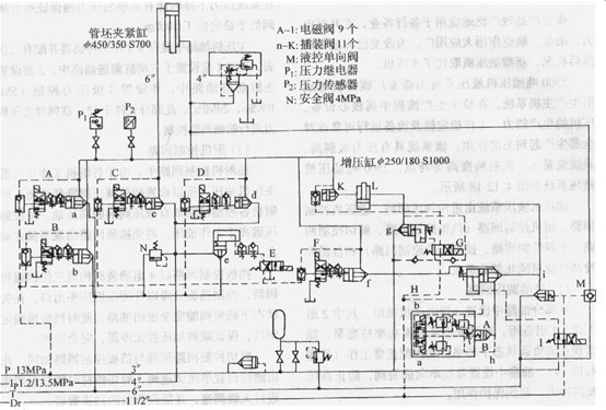 設計最快生產節奏為27s/根,夾緊缸尺寸Φ450mm/Φ350mm,行程700mm,要求夾緊缸必須快速工作,工作流量2.23×l0^3L/min,故夾緊回路采用了大流量的插裝回路及一臺螺桿泵(1 35×l0^3L/min,1,2/3.5MPa)供油。整個回路的控制壓力為13MPa,供管坯夾緊回路的壓力為13MPa。