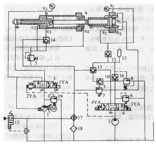 三位四通換向閥3的電磁鐵1YA通電,P1泵的壓力油經柱塞缸C1口進入柱塞缸,柱塞向前運動,柱塞桿腔的叫油經閥14和油口c3進入柱塞缸,柱塞快速向前運動;而c2處的回油經二位四通換向閥3注入油箱;當柱塞一接觸到粉團時,柱塞桿腔的壓力就升高,柱塞減速,這時回油經溢流閥5流人油箱,回油壓力由溢流閥5控制。