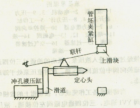 熱定心裝置如圖2所示。此裝置不管管坯的尺寸如何,始終能自動地在管坯端面中心沖出一個孔。管坯被夾緊缸夾緊后,由另一液壓缸推動定心頭對管坯前端面沖孔,由于管坯的尺寸不同,所需的爽緊力不一樣,在設計上采用了壓力型插裝閥及增壓缸,可使最大夾緊力達到2.94kN。