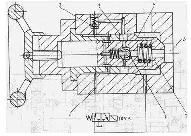 基于壓鑄成型下藝的特殊要求,壓射部分液壓管路的設計流速,一般可取25~30m/s,否則液壓管路和元件將變得十分龐大,使整個壓射機構難于安排。蓄能器按絕熱狀態計算。方向閥要滿足快速啟動和大流量的要求。第一級快速壓射閥34是普通插裝閥,第一級快速壓射閥是一種特殊結構的插裝閥,它允許通過的壓力油的流量不低于4200L/min,具有快速啟動和自動關閉的性能,不需要大的先導閥控制,其結構簡圖見圖3。閥的a腔與壓射蓄能器22和31相通,b腔接壓射缸的無桿腔,當先導電磁閥10YA動作時,c腔回油并向閥l左腔回油,其閥芯打開,d腔中的油流進b腔。于是主閥芯2左移,使a腔接通,進行快速壓射。快壓射結束時,10YA斷電,壓力油進入c腔,一路關閉單向閥,另一路經單向閥3進入d腔關閉主閥芯2。