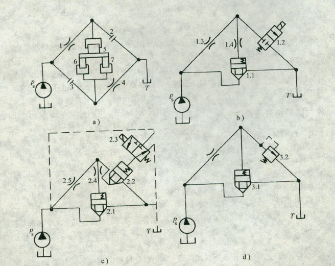 臂1、4為有限值(相當(dāng)于此橋臂上閥開啟但有液阻)時,高壓油進入缸5,缸6、7排油,鍛錘向下運動。反之,當(dāng)橋臂1、4液阻為無限大;橋臂2、3為有限值時,錘頭向上運動。橋臂各液阻的變化由相應(yīng)的主插裝閥完成。圖4b是控制插裝閥肩閉的油路。其中4個閥都是控制某一橋臂1的,1.l為主插裝閥,1.2是先導(dǎo)換向閥,1.3、1.4為液阻。由于大通徑插裝閥通過的流量很大,所以先導(dǎo)換向閥也采用插裝閥,如圖4.12-lle所示。例如該圖中的各閥都是控制某一橋臂2的,當(dāng)先導(dǎo)球閥2.3得電后,壓力油進入插裝閥2.2上腔使它關(guān)閉,壓力油通過液阻2.5、2.4使主插裝閥2.l關(guān)閉,此時橋臂2的液阻為無窮大。反之當(dāng)2.3失電時,2.2上腔放空而開啟,油經(jīng)過液阻2.5后,K點壓力下降,插裝閥2.1開啟,橋臂2的液阻為有限值。2.4和2.5的阻值影響主插裝閥2.1的開、閉速度。圖4.12一11d表示壓力控制橋路,例如圖中各閥是控制某一橋路3的,閥3.1的溢流壓力取決于閥3.2的調(diào)定值。