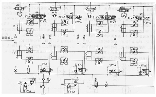 某機的液壓原理如圖4.9-6所示,主要由主機、液壓站、矯正輥驅動設備、傳輸裝置及操縱控制臺組成。