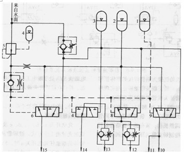 1、2、3、4-蓄能器   5-調壓減壓閥   6、7、8、9-液控換向閥