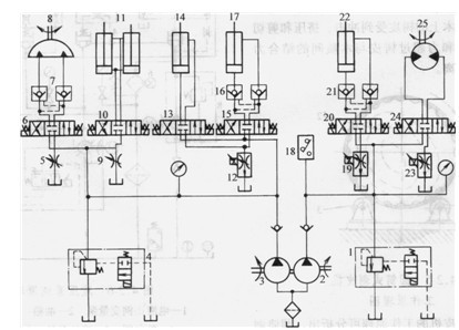 擺動缸8是驅動采集爪左右擺動的,由電磁閥6來控制,單邊擺動角度為135°,擺動速度由節流閥5來調節。閥7、16、21為雙向液壓鎖,是使采集爪擺動后定位之用的。缸11為采集爪開合缸,由電磁閥10來控制。最大開度為上下兩齒間距0.9m,由節流閥9來調節其開合時的運動速度。腕部缸14控制采集爪的俯仰,上下俯仰角可達90°。小臂缸17由電磁閥15來控制。由于腕部和小臂缸一般不同時工作,故采用同一電液比例調速閥12進行控制。大臂缸22由電磁閥20來換向,由電液比例調速閥19進行控制。從而構成雙泵雙回路的電液比例控制系統。該系統負責控制工作中的小臂或大臂與腕部之間的協調動作。回轉馬達25通過蝸輪蝸桿和齒輪齒圈減速器驅動回轉盤并帶動機械手左右回轉。它的工作速度由節流閥23來調節,轉動方向由電磁閥24來控制。壓力繼電器18是對大臂缸22進行過載保護的,當其作業過程中發生過載時即可發出電信號使泵卸載。