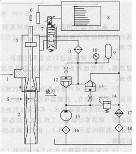 1-半熔融塑料;2-型坯;3芯頭;4-口模;5一液壓缸;6一位移反饋傳感器; 7-電液伺服閥;8-控制器;9一蓄能器;10-壓力表;11、1 6、18-過濾器; 12、13-插裝閥;14-溢流閥;15-定量液壓泵;17-冷卻器
