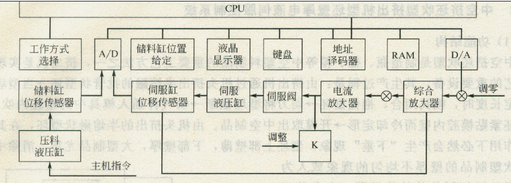 系統(tǒng)的油源為定量液壓泵15,泵的壓力油經(jīng)插裝式單向閥12、精過濾器11向伺服閥7供油,系統(tǒng)壓力由溢流閥14設(shè)定并由壓力表10顯示。蓄能器9用于蓄能和吸收壓力脈動(dòng)以減小泵的排量和穩(wěn)定工作壓力。伺服閥出口油液經(jīng)冷卻器1 7和回油過濾器18回到油箱。停機(jī)時(shí),蓄能器通過插裝閥13釋壓。系統(tǒng)的執(zhí)行器為電液伺服閥7控制的液壓缸5,缸的上端設(shè)有位移反饋傳感器6,伺服閥7接受控制器8的指令信號(hào),輸出流量驅(qū)動(dòng)液壓缸5帶動(dòng)芯頭3按所需控制規(guī)律運(yùn)動(dòng),機(jī)頭出口縫隙S則按此規(guī)律控制型坯的厚度。位移傳感器6感受伺服液壓缸活塞即芯頭3的位移信號(hào),送至控制器中,實(shí)現(xiàn)芯頭運(yùn)動(dòng)的閉環(huán)控制。以微處理器( CPU)為核心的型坯壁厚控制器是本系統(tǒng)的心臟部分,其原理方塊圖如圖4-25所示,它具有工作方式(收斂式或發(fā)散式等)設(shè)定、系統(tǒng)工作狀態(tài)顯示、工作參數(shù)預(yù)置和輸入、模擬信號(hào)處理等功能。