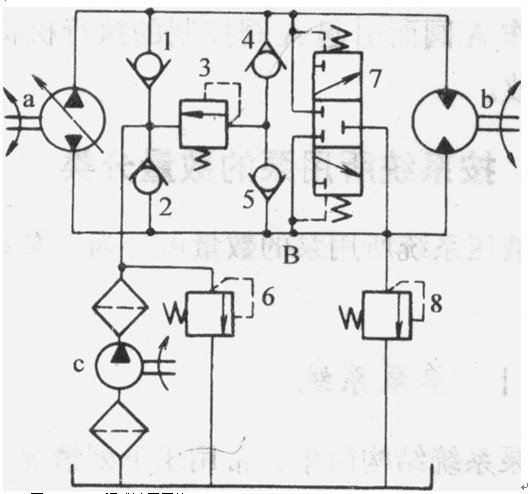 在發(fā)熱量較大的閉式系統(tǒng)中,為改善系統(tǒng)的散熱情況,需增加補(bǔ)油量,故增設(shè)低壓選擇閥(圖中的閥7),使系統(tǒng)經(jīng)常有部分低壓油經(jīng)閥7排回油箱。但此時輔助泵c的流量應(yīng)是主泵a的流量的20%~30%。