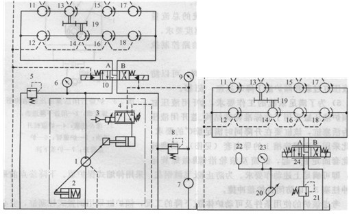 1、2一定量柱塞泵;3、4-單向閥;5、14、15、16-壓力表開關;6、17、18、19-壓力表;7、10 -截止閥;8、9-電磁溢流閥;11-泥炮旋轉液壓缸;12-壓炮液壓缸;13-打泥液壓缸;20-減壓閥;21、22、23-雙單向節流閥;24、25、26-雙向液壓鎖;27、28、29-三位四通手動換向閥