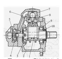 1-曲軸;2-殼體;3,9-圓錐滾子軸承;4-配流盤;5-端蓋;6-柱塞缸;7-柱塞;8-連桿;10-軸封