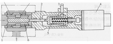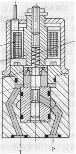 圖6-57所示為錐閥型高速開關電磁閥。當線圈4通電時,與閥心1為一體的鐵心2被固定元件3吸引而使閥開啟,油液由P口流人T口。為防止開啟時閥因穩態液動力而關閉和減小控制電磁力,該閥通過射流對鐵心的作用來補償液動力。斷電時則由彈簧復位。該閥的行程為0. 3mm,動作時間3ms,控制電流0.7A,額定流量12 L/min。