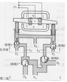 圖6-56所示為用力矩馬達和球閥組成的高速開關型數字閥。力矩馬達某一線圈通電時如銜鐵順時針偏轉,便推動先導級球閥2向下運動,關閉壓力油口P。。L:腔與回油P。接通,球閥4在液壓力作用下上升,PA腔與壓力油P。相通。而左邊的先導級球閥1壓在上邊位置,Li腔與壓力油通,球閥3向下關閉,PA腔與回油腔PR斷開。反之,當另一線圈通電使銜鐵逆時針偏轉時,情況剛好相反,PA腔與回油腔PR相通。這種閥的流量小,僅1.2L/min,工作壓力可達20MPa,最短切換時間0.8ms。