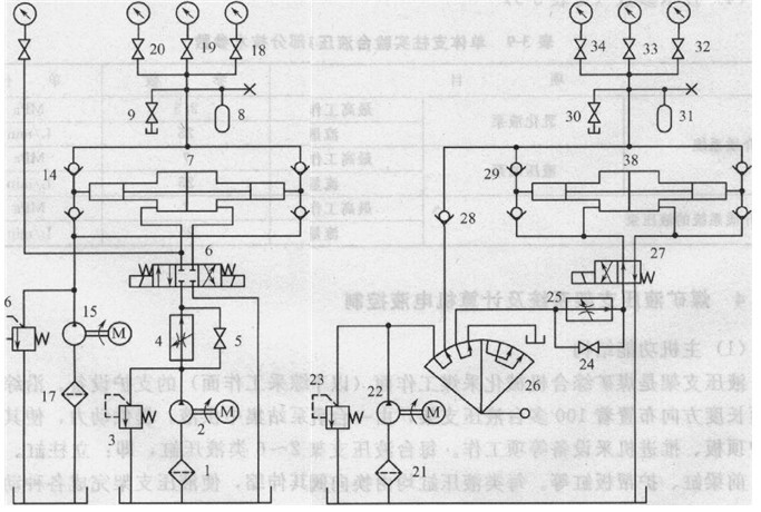 1 5、9、18、19、2024、30、32、33,34-截止閥;6-三位四通電磁換向閥;7、38-增壓器;8、31-蓄能穩壓器;10、35-低壓壓力表;11、36-高壓壓力表;12、37一超高壓壓力表;13-油壓壓力表;14、28、29單向閥;26-二位四通手動換向轉閥;27-二位四通電磁換向閥