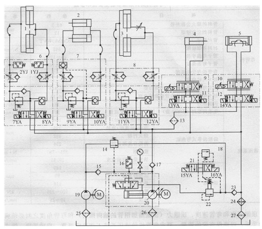 1-頂鐓央緊液壓缸;2-收緊液壓缸;3-彎管模液壓缸;4一頂鐓液壓缸; 5-齒輪齒條式彎曲液壓缸;6、7、8缸1、2、3的液壓閥油路;9、10電赦伺服閥; 11、12三位四通電液換向閥;13、25、26、27過濾器;14-遠控順序閥; 15、17、23-單向閥;16-壓力繼電器;18-遠程調壓溢流閥;19-定量液壓泵;