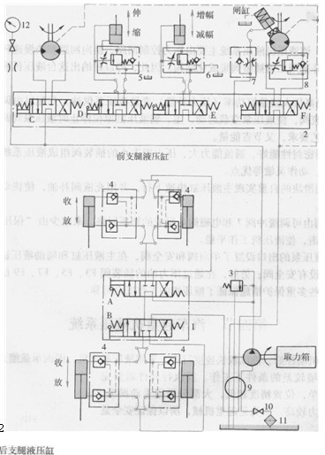 2多蹄閥3安全閥4-雙向被壓鎖5、6、8-平衡閥7-單向節流閥9-中心回轉接頭10-fl關11-過濾器12-壓力表