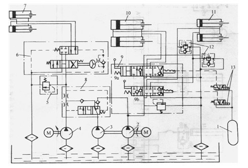 1一儲氣罐2、3雙聯液壓泵4-轉向液壓泵5-溢流閉6-轉向控制閥7-轉向液壓缸8流量控制閥9多路換向閥10-動臂液壓缸11-翻斗液壓缸12-雙溢流閥13電磁閥