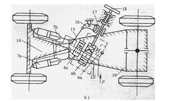 轉向時,前車架棚對后車架左右擺動。轉向動作由液壓缸7a和7b驅動,這兩個液壓缸的有桿腔和無桿腔互聯,一個液壓缸的有桿腔和另一個液壓缸的無桿腔同時進、排油。控制閥6a和6b控制著轉向液壓缸的動作。當轉動方向盤18時,帶動轉向螺母旋轉,轉向螺母帶動控制閥6a的閥芯,但閥芯受機械結構限制并不轉動,僅作軸向運動,使閥口有一個開度。提供給轉向系統的高壓油推開切斷控制閥6c,進入轉向液壓缸。液壓缸運動時通過反饋桿15、轉向臂16帶動轉向螺母反向旋轉,使打開的閥口關閉,從而達到一個新的平衡。切斷控制閥6c的作用是:當方向盤不動時,路面引起的干擾力不能使前支架擺動。單向節流閥的設置使得切斷閥的動作打開時動作迅速,切斷時比較緩慢,這有利于防止液壓沖擊。