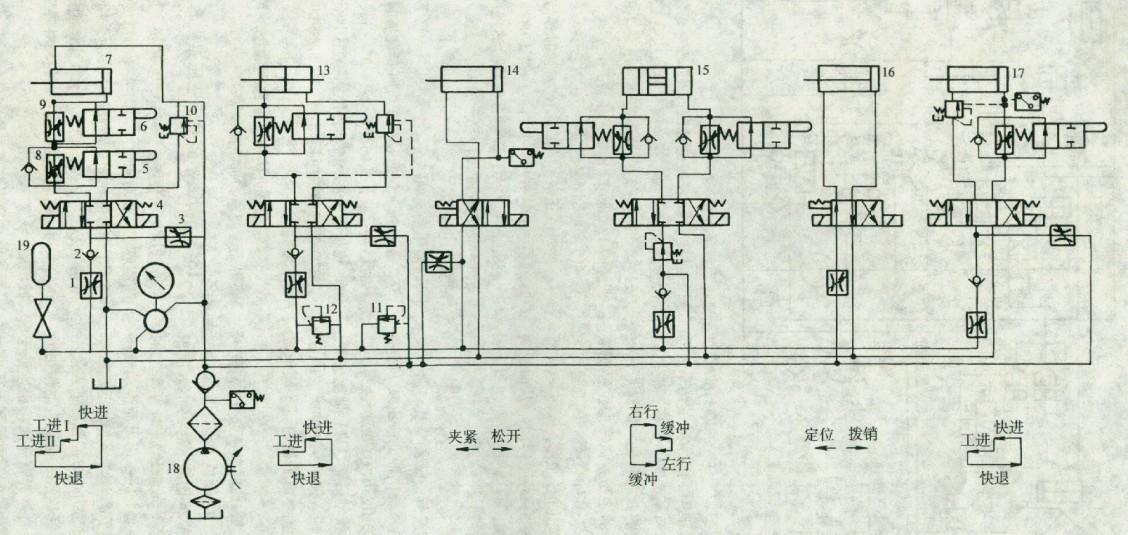 在圖1中,液壓缸7,液壓缸13和液壓缸17分別控制三個滑臺。液壓缸14為夾緊缸,液壓缸15為輸送工件液壓缸,液壓缸l6為定位缸。由三位四通或二位四通換向閥分別控制各液壓缸的往復運動。在油路中可以不接人調速閥,可以接入一個調速閥(如液壓缸13,液壓缸17的油路),也可接人兩個串聯的調速閥(如液壓缸7、液壓缸15的油路),用這種方法使液壓缸7、液壓缸13、液壓缸17進行速度換接完成快進、工進I和工進Ⅱ等動作,同時還可使液壓缸15在每個方向上完成常速和緩沖的速度換接。