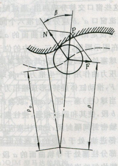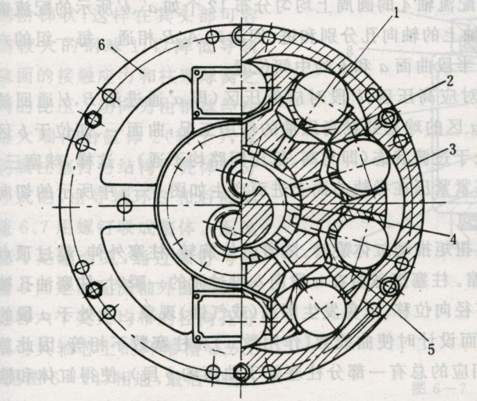 它由轉子缸體2、導軌3和柱塞5-鋼球1組成的球塞副、配流軸.4、外殼6等組成。圖1為具有10球塞六作用次數的馬達。所謂作用次數z,即每個球塞隨轉子轉一轉往復的次數,也即導軌所具有的曲線凹凸數。配流軸4的作用是依次將高壓油分配給各球塞,并將低壓油從各球塞依次通過配流軸排出。柱塞5在高壓油推動下,帶動鋼球1沿徑向向外運動,與曲線導軌3接觸,鋼球1與導軌曲線的相互作用如圖6-5所示。柱塞副所產生的液壓力P是沿柱塞軸線的。該力分為兩個力Ⅳ與F,Ⅳ力與導軌曲線相垂直,并與導軌曲線的反力相平衡。分力F即為推動缸體旋轉的切向力。切向力F與向徑P(P為滾輪中心至馬達旋轉中心的距離)的乘積即為該球塞所產生的扭矩。各作功柱塞產生的扭矩之和即為液壓馬達在該瞬時的輸出扭矩。 為便于讀者進一步了解,現以六作用八球塞的馬達導軌展。