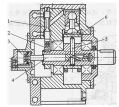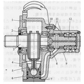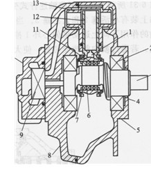 1-前蓋;2,10-滾動軸承;3-曲軸;4-殼體;5-連桿6-柱塞,7-缸蓋;8-十字形聯軸器;9-集流器;11-滾針軸承;12-配流軸(配流轉閥)