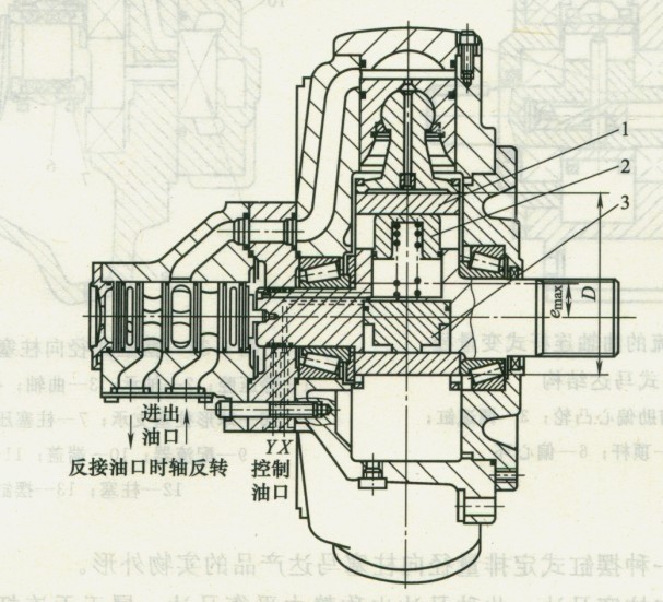 圖3所示為單作用曲軸連桿式變量徑向柱塞馬達結構。通過改變偏心距使馬達變量。在曲軸上裝有小活塞2和大活塞3。當小活塞腔通人控制油、大活塞腔通回油時,小活塞在壓力油的作用下向上運動將偏心環1推至最大偏心位置,此時馬達排量和輸出轉矩最大,轉速最低。若通過換向閥改變位置,使大活塞腔通入控制油、小活塞腔通回油時,大活塞在壓力油的作用下向下運動將偏心環推至最小偏心位置,此時馬達為小排量,在供油量相同的情況下,輸出轉速提高,而輸出扭矩相應降低。偏心距的改變可在馬達運轉中平穩進行;可利用馬達本身壓力油作控制油,省去了控制油源;這種馬達可以和定量泵組合構成容積調速回路,有效地實現恒功率調速。特別適合用于牽引絞車或驅動車輛的車輪。