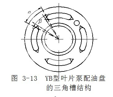 在結(jié)構(gòu)上要保證吸油腔和壓油腔互不串通,故運(yùn)轉(zhuǎn)過程中將存在閉死容積。雙作用葉片泵理論上閉死容積不變化,不產(chǎn)生困油現(xiàn)象,但實(shí)際上考慮葉片厚度則會有困油現(xiàn)象,為此在壓油窗口開有三角槽(如圖3-13),所示以防困油現(xiàn)象的產(chǎn)生。