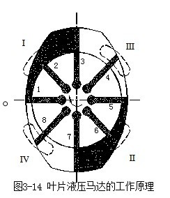 兩側(cè)受同樣大小的壓力,不產(chǎn)生轉(zhuǎn)矩。處在工作段的葉片3、7和1、5,一側(cè)受高壓而另一側(cè)受低壓作用,葉片3伸出的面積大于葉片1伸出的面積,葉片7伸出的面積大于葉片5伸出的面積。產(chǎn)生順時(shí)針方向的轉(zhuǎn)矩,使轉(zhuǎn)子軸克服外載荷轉(zhuǎn)矩而旋轉(zhuǎn),輸出機(jī)械能。因此同樣的,當(dāng)Ⅲ、Ⅳ進(jìn)油,I、II回油時(shí),葉片液壓馬達(dá)產(chǎn)生逆時(shí)針方向的轉(zhuǎn)矩。這就是葉片液壓馬達(dá)的工作原理。