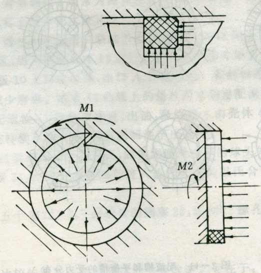 馬達運轉時,應使密封環壓在孔壁上不動,運轉時,旋轉運動副當發生在配流軸的環槽側壁與相對密封環的側面上。若密封環隨配流軸轉動,則配流缸壁很快會磨出凹槽而破壞密封作用,因此,在設計時要根據M1>M2的要求確定密封環的內半徑r1,并校核環內側壁與密封環的接觸比壓。 密封環兩側面平行度之差為0.O1mm,端面與內、外圓柱面垂直度允差為0.O1mm。