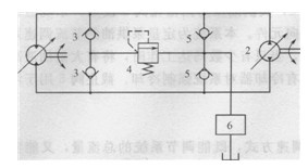 -變量馬達;2-變量泵;3、5-單向閥;4-溢流閥;6-真空吸入閥